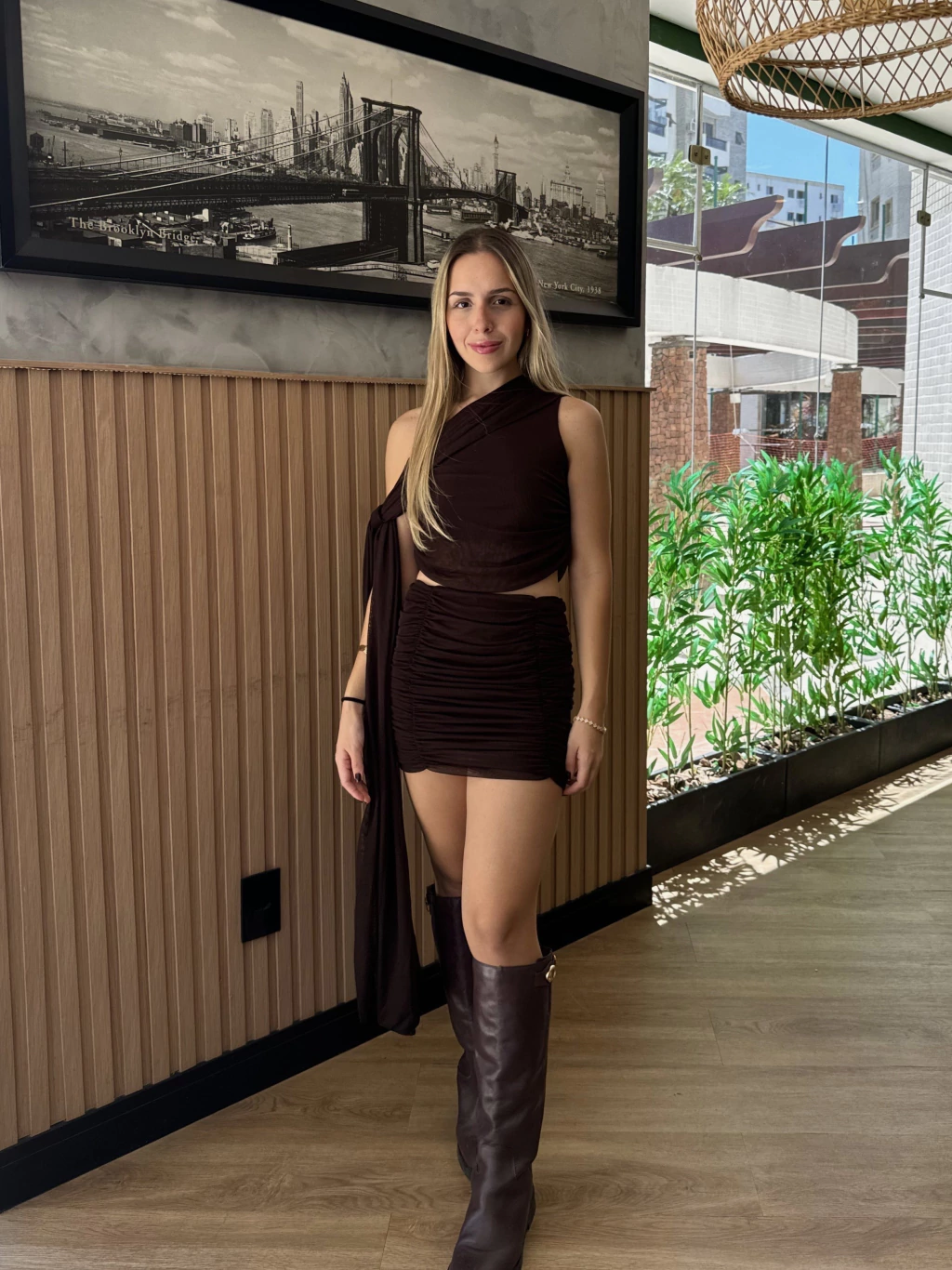 A saia drapeada modela a silhueta e traz um toque sofisticado, já o cropped com amarração no braço é super moderno e estiloso. O conjunto é super versátil, podendo usar as peças juntas ou separadas.